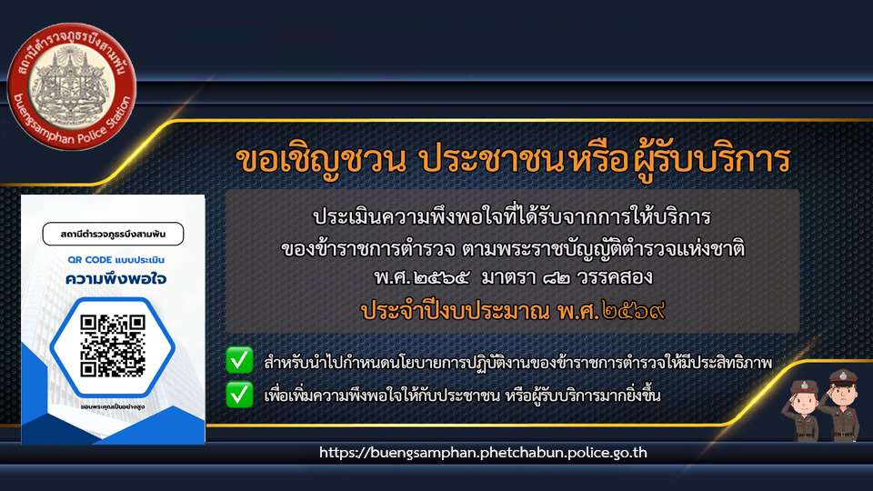 ขอเชิญชวนประชาชน หรือ ผู้รับบริการ ประเมินความพึงพอใจการให้บริการของสถานีตำรวจ 27 มีนาคม 2026 โดย admin / ข่าวประชาสัมพันธ์,ข่าวกิจกรรม,ข่าวประชาสัมพันธ์ สถานีตำรวจภูธรบึงสามพัน ขอเชิญชวนประชาชน หรือ ผู้รับบริการ ประเมินความพึงพอใจการให้บริการของสถานีตำรวจ ตามพระราชบัญญัติตำรวจแห่งชาติ พ.ศ.2565 มาตรา 82 วรรคสอง ประจำปีงบประมาณ พ.ศ. 2569
